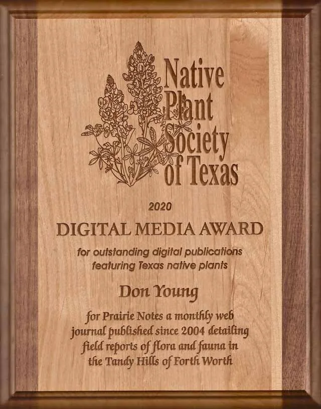 The Native Plant Society of Texas and Friends of Tandy Hills crossed paths more than usual in October. NPSOT celebrated their 40th Anniversary in October with a weeklong schedule of events. On the final night of the virtual event, yours truly was accepted the, 2020 Digital Media Award for Prairie Notes.